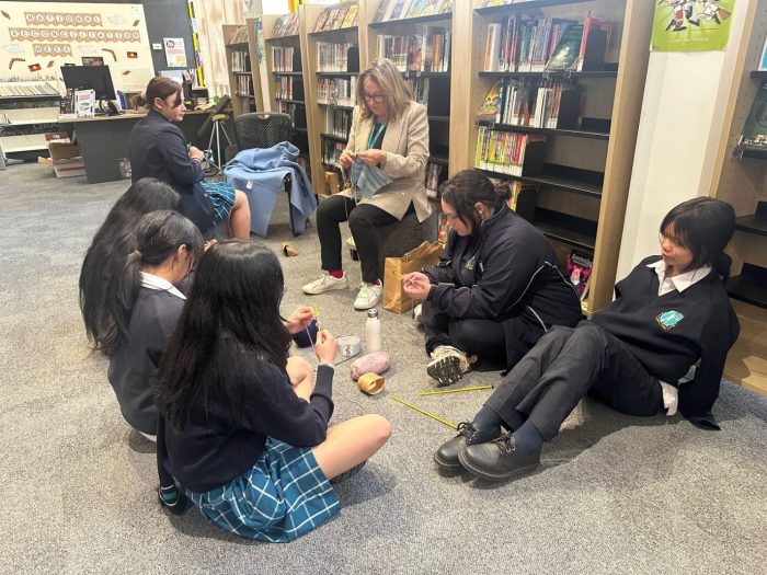 Cobblebank's inaugural knitting circle began in the library space recently, with Principal Marlene Jorgensen skillfully showing the students how it's done.