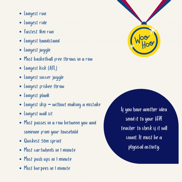 Once they have selected their activity, students will record their efforts and submit them to their HPE teacher. All results for each activity will be collated and the student with the best result will be the inaugural record holder for that activity.
